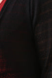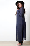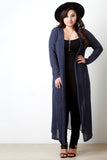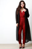 This longline plus size cardigan features a knit crochet fabric with contrasting chiffon, longsleeves construction, and open front design. Accessories sold separately. Made in U.S.A. Sefl: 97% Polyester, 3% Spandex. Contrast: 100% Polyester.
