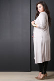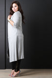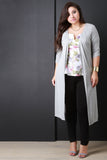 This longline plus size cardigan features a soft rib knit fabrication, collarless design, open front with no closures, and three quarter sleeves with ruched detail. Accessories sold separately. 83% Polyester, 13% Rayon, 4% Spandex.