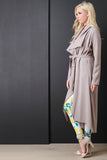 This trench-like jacket , features long sleeves with a draped open front silhouette and a belted sash. Woven crepe, unlined, light-weight, long-line. Accessories sold separately. Made in U.S.A. 97% Polyester. 3% Spandex.