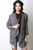 This light weight layered jacket features a linen fabrication, open drape front, quarter-length sleeves with cuff button tab option, and a hidden drawstring cinched design at back waist. Accessories sold separately. 60% Cotton, 40% Linen.