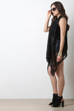 This sleeveless cardigan features a crochet lace fabrication, open front design, and long asymmetrical hemline. Accessories sold separately. 100% Acrylic.