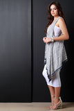 This sleeveless cardigan features a marled knit fabrication, contrasting fringe trim, open front and long asymmetrical hemline. Accessories sold separately.