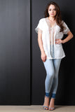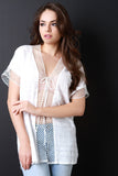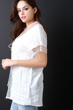 This stylish cover-up kimono features a texturized woven fabrication, fishnet trimming and paneling detail, and front self-tie drawstring. Accessories sold separately. Self: 100% Cotton. Trim: 100% Polyester.