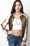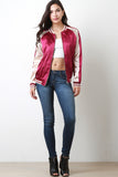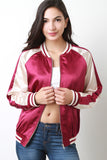This varsity jacket features a two tone design, striped long sleeves, striped ribbed knit hem, working side pockets, zipper front, and fully lined. Accessories sold separately. 100% Polyester.