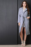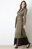 This trench style jacket features an open front, large notch collar, long sleeves, flap pockets, side slit vents, and a self-tie waist sash. Accessories sold separately. 95% Polyester, 5% Spandex.