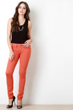 These skinny jeans feature lightweight denim, 5 pockets, single button and zipper fly, belt loops, and finished with stitching detail. Made in U.S.A. 98% Cotton, 2% Spandex.