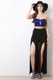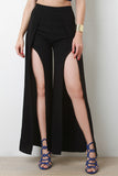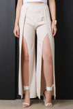 These high waist pants features a wrap front design, woven fabrication, flare cut ad a hidden back zipper closure. Accessories sold separately. Made in U.S.A. 97% Polyester 3% Spandex.
