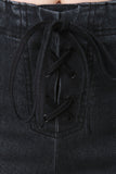 These high waist jeans feature a stretch denim fabrication, 4 pocket design, lace up front, invisible side zip closure, and flare cut legs. Accessories sold separately, 75% Cotton, 21% Polyester, 4% Spandex.