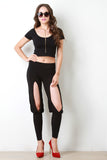 These pants feature a mid rise elastic waist, half relaxed fix with tighter bottom half for a jodhpur style silhouette, and open slits on the thighs. Accessories sold separately. Made in U.S.A. 95% Polyester 5% Spandex.