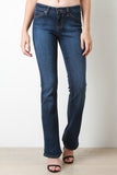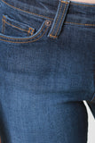 These jeans are boot cut, featuring belt loops, 5 pocket design, and button zipper fly closure. Mid rise. Dark blue wash with fading. Accessories sold separately. 73% Cotton, 14% Rayon, 11% Polyester, 2% Spandex.