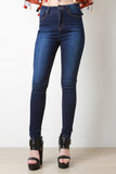 These jeans are skinny legging cut, featuring belt loops, 5 pocket design, and button zipper fly closure. Mid rise. Blue wash with fading. Accessories sold separately. 80% Cotton, 18% Polyester, 2% Spandex.