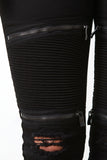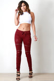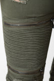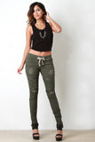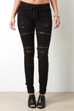 These distressed jeans feature an elastic waistband, self tie draw string, moto style design, 4 pocket design, distressed patches, metal zipper details, top stitching, and ruched slim cut legs. Accessories sold separately. 97% Cotton 3% Spandex.
