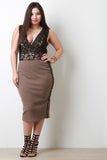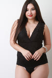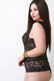 A plus size sleeveless bodysuit featuring floral lace, v-neck, and double snap button crotch closure. Partially lined. Accessories sold separately.90% Nylon, 10% Spandex.