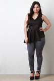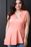 This peplum plus size top features a v-neckline, sleeveless construction, smooth fabrication and an asymmetrical hemline. Accessories sold separately. Made in U.S.A. 95% Polyester , 5% Spandex.