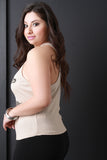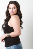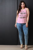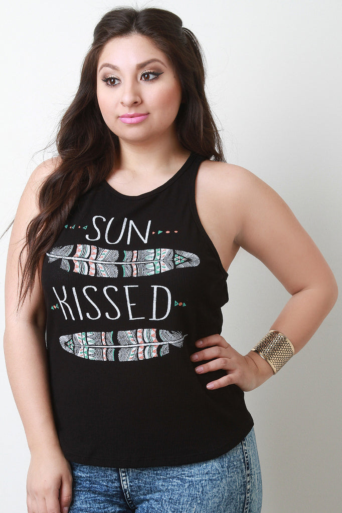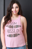 This casual plus size top features a round neckline, "SUN KISSED" graphic print at front with feather designs, sleeveless construction and thermal knit fabrication. Accessories sold separately. Made in U.S.A. 95% Rayon, 5% Spandex.