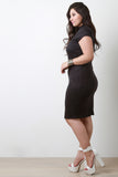 This plus size micro fiber vegan suede dress features a mock neckline, cap sleeves, an exposed zipper closure in the back, and knit fabrication. Accessories sold separately. Made in U.S.A. 95% Polyester, 5% Spandex.