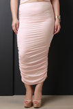 This plus size midi skirt features soft vegan suede, and ruched side detail with an elastic waistband. Accessories sold separately. Made in U.S.A. 95% Polyester 5% Spandex.