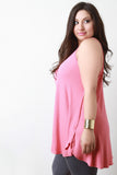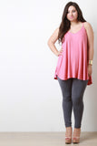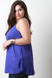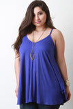 This plus size top features a ribbed knit fabrication, v-neckline with spaghetti shoulder straps, sleeveless construction, raw side edge, and flare hemline. Accessories sold separately. Made in U.S.A. 95% Rayon, 5% Spandex.