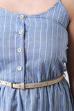 This striped knit fabrication, scooped neck with spaghetti shoulder straps, button up front, and gathered waistline with contrast belt. Accessories sold separately. Made in U.S.A. 100% Cotton.