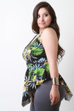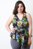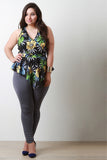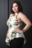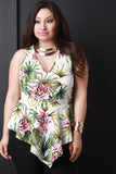 This peplum plus size top features a v-neckline, sleeveless construction, smooth fabrication with floral print throughout, and an asymmetrical hemline. Accessories sold separately. Made in U.S.A. 97% Polyester, 3% Spandex.