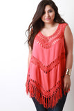 This plus size top features a woven knit fabrication, sleeveless fit, crochet and macrame knot details, and finished with fringe hemline. Accessories sold separately. 40% Acrylic, 40% Cotton, 20% Polyester.