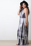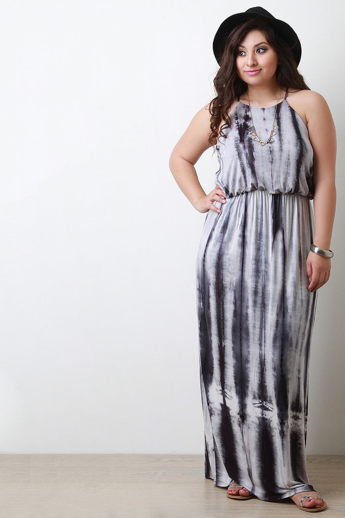 This plus size maxi dress features a sleeveless design, spaghetti straps, high neckline, elastic waist, fully lined, relaxed fit and a key hole back finished with a button closure at nape. Accessories sold separately. 97% Rayon, 3% Spandex.