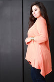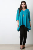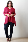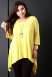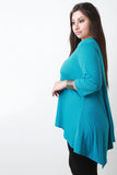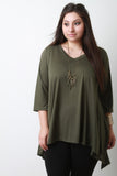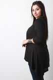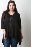 This plus size top has a v-neckline with quarter sleeves, featuring a back stitching detail. Flowy silhouette. Sharkbite hemline. Accessories sold separately. 87% Polyester. 10% Rayon. 3% Spandex.
