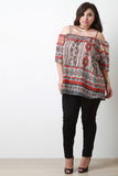 This plus size blouse top features a tribal print fabrication, cold shoulder design, spaghetti straps, elbow flare sleeves, and flowy fit. Accessories sold separately. 48% Polyester, 48% Rayon, 4% Spandex.