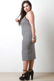 This plus size dress features horizontal stripes on ribbed knit fabrication, v-neckline, spaghetti shoulder straps, crisscross back, and midi length hemline. Accessories sold separately. Made in U.S.A. 95% Rayon, 5% Spandex.