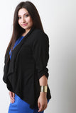 This plus size blazer features a textured knit fabrication, handkerchief hemline, cinched three quarter sleeves, open front, and back pleating detail. Accessories sold separately. 100% Polyester.