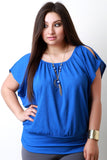 This plus size top features a texturized knit fabrication, boat neckline, cold shoulder, short dolman sleeves, and includes a necklace. Finished with a wide elasticized band hemline with cinched sides. Other accessories sold separately. Made in U.S.A. 96% Polyester, 4% Spandex.