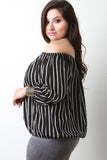 This plus size top features an elasticized bardot neckline, long sleeves, elasticized hemline, and contrasting vertical stripes. Accessories sold separately. Made in U.S.A. 100% Rayon.