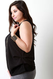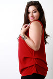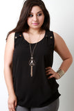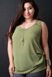 This plus size top features a textured woven fabric, scoop neckline, sleeveless fit, and gold buttons accent to compliment the included necklace. Finished with layering sides detail. Other accessories sold separately. Made in U.S.A. 100% Polyester.