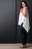 This plus size tank top features a thin sweater knit fabrication, rounded neckline, sleeveless design, "Thank You" graphic print in five languages, and a wide square cut high low hem with side slits. Accessories sold separately. Made in U.S.A. 62% Rayon, 38% Polyester.