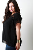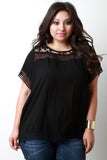 This plus size top features a woven fabrication, crochet insets detail and trim, round neckline, and relaxed fit. Accessories sold separately. 65% Cotton, 25% Polyester.