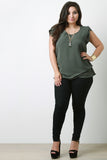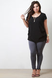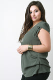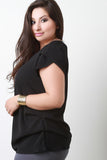 This p lus size blouse features a scooped neckline, tulip sleeves design, gather side detail, and keyhole cutout with button closure at nape. Top comes with triple gemstones pedant necklace. Accessories sold separately. 100% Polyester.
