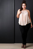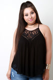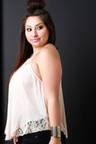 This cutesy plus size top features a woven fabrication, crochet lace insets and trim, rounded neckline, and thin shoulder straps. Finished with a raceback and rounded hemline. Accessories sold separately. Self: 100% Polyester. Contrast: 100% Cotton.