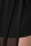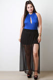 This plus size skirt features semi-sheer mesh, elasticized waist, maxi length, side slit, and finished with inner skirt lining. Accessories sold separately. Made in USA. Self: 90% Polyester, 10% Spandex. Contrast: 95% Polyester, 5% Spandex.