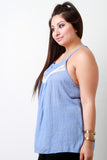 This plus size top features a woven fabrication, crochet inset with ruffle details, scoop neckline, and thin shoulder straps. Accessories sold separately. Made in U.S.A. 100% Cotton.