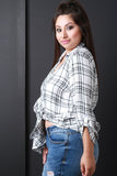 This plus size top features a plunging collar neckline, self-tie front, long sleeves with a button tab cuff option, and plaid print design. Accessories sold separately. 100% Polyester.