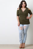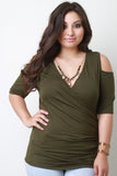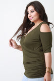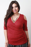 This p lus size top features a v neckline, short sleeves with cold-shoulder cutouts, and wrap construction with side ruched detail. Top comes with beaded faux pearl charm necklace. Accessories sold separately. 97% Rayon, 3% Spandex.