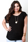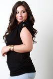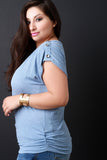 This plus size top features a ribbed knit fabrication, boat neckline, cap sleeves with button accent on shoulders, and side ruching detail. Finished with a rounded hemline. Accessories sold separately. Made in U.S.A. 67.5% Rayon, 21.2 Polyester, 11.3% Spandex.