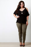 This plus size top features a lightweight woven fabric, ruffle-detailed cold shoulder, v-neckline, dolman sleeves, and ruched elasticized midriff. Finished with a self-tie drawstring closure at nape. Accessories sold separately. Made in U.S.A. 100% Rayon.