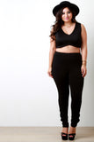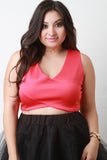 This plus size crop top features smooth stretch fabric, criss-cross style design, deep v-neckline, and sleeveless construction. Accessories sold separately. Made in USA. 95% Polyester, 5% Spandex.
