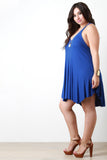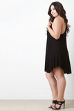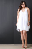 This plus size dress features a soft rib knit fabrication, v neckline, racerback design , flare shift style silhouette, raw asymmetrical zig zag hemline. Accessories sold separately. Made in U.S.A. 96% Rayon, 4% Spandex.