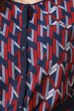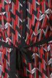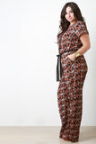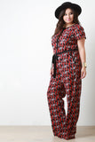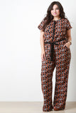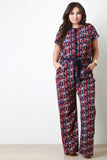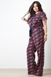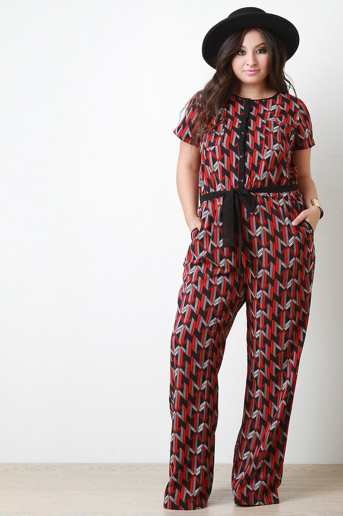 This plus size jumpsuit features a woven fabrication, multi colored geometric print. button up front closure, rounded neckline elastic waist, front pockets, short sleeves, contrast ribbon belt and a wide cut leg. Accessories sold separately. 100% Polyester.