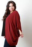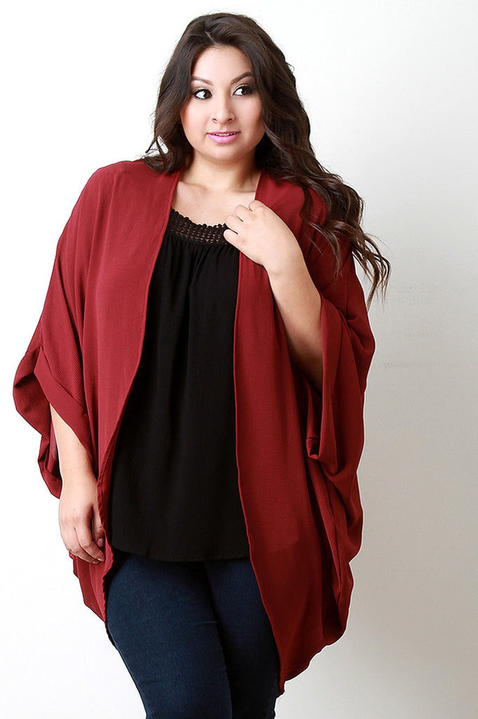 This plus size cardigan features a textured woven fabric, folded end dolman sleeves, open front draped construction, and high-low hemline. Accessories sold separately. Made in U.S.A. 100% Polyester..
