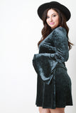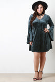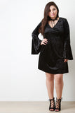 This plus size mini dress is A-line silhouette with a slightly flared bottom. V-neckline. Long sleeves with flare bell sleeves. Stretchy velvet fabrication. Hook and loop choker necklace included. 92% Polyester. 8% Spandex. Made in USA.