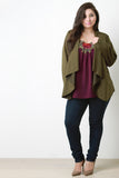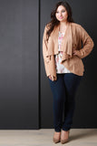This plus size jacket features a soft vegan suede fabrication, draped collar, long sleeves, two front zipper pockets, and no closure. Accessories sold separately. 100% Polyester.