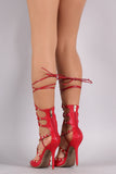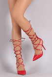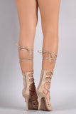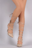 This striking pointy toe silhouette, pyramid studs detailing, strappy construction with lace up design, and wrapped stiletto heel. Finished with lightly padded insole and convenient back-zip closure.